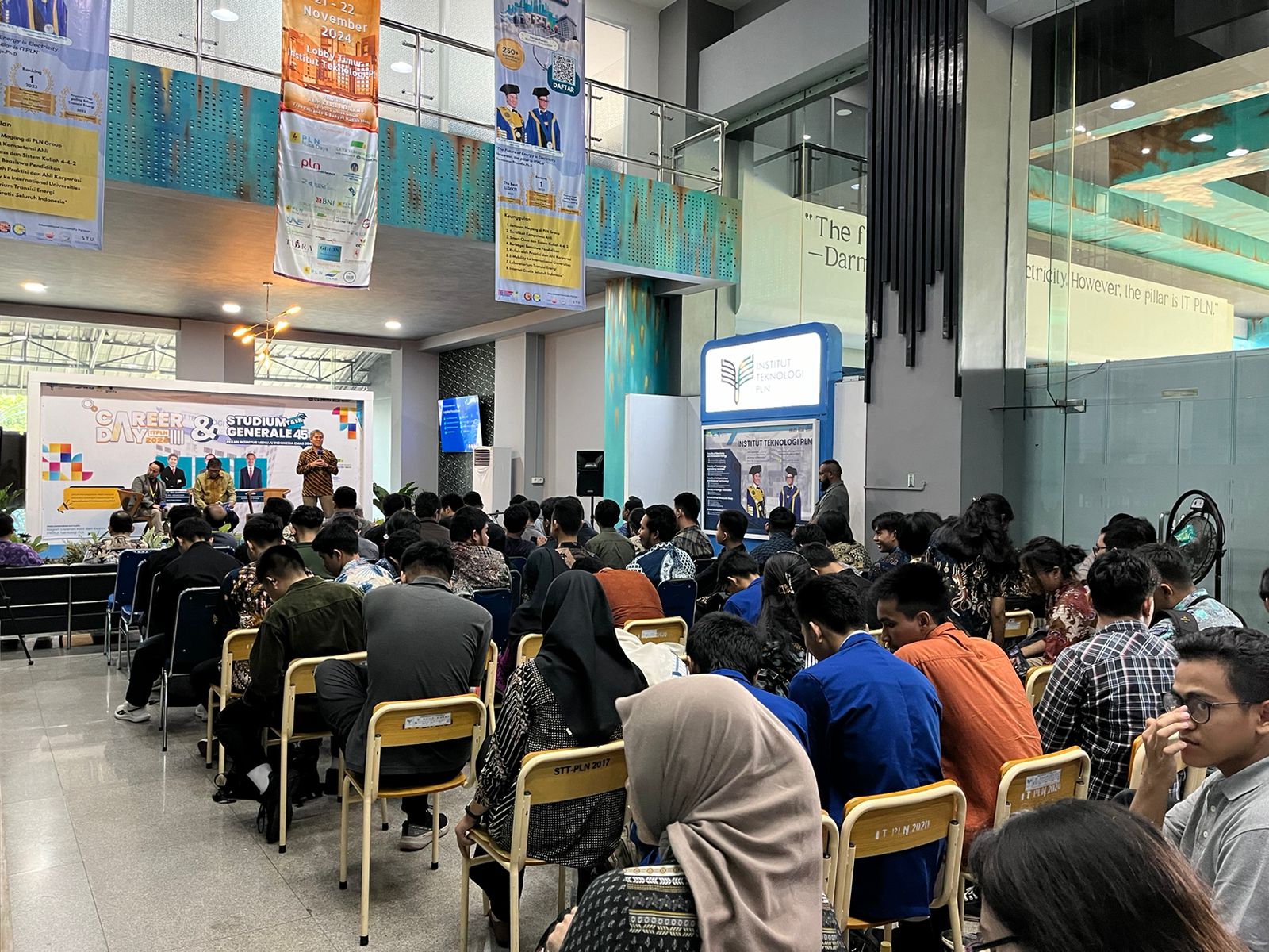 Career Day dan Studium Generale Sukses Digelar Institut Teknologi PLN (ITPLN). Rangkaian kegiatan berlangsung dari 21 – 22 November 2024, menghadirkan jajaran Direksi PLN sebagai pembicara. Acara ini berlangsung dengan meriah di Kampus ITPLN, menarik perhatian mahasiswa dan peserta lainnya yang antusias untuk mendapatkan wawasan terkait pengembangan karir di masa mendatang
