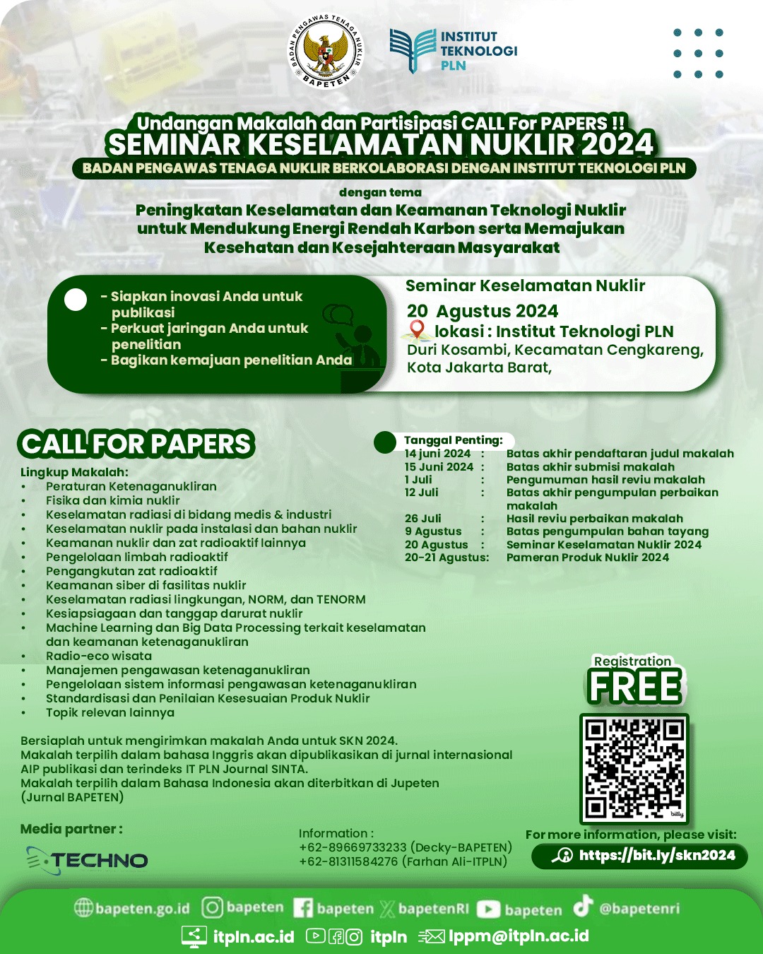 Seminar Keselamatan Nuklir (SKN) 2024 akan diselenggarakan pada 20 Agustus 2024 di Institut Teknologi PLN, Jakarta. Untuk itu, kami mengundang partisipasi anda untuk mengirimkan makalah terkait tema SKN 2024 yaitu “Peningkatan Keselamatan dan Keamanan Teknologi Nuklir untuk Mendukung Energi Rendah Karbon serta Memajukan Kesehatan dan Kesejahteraan Masyarakat.”