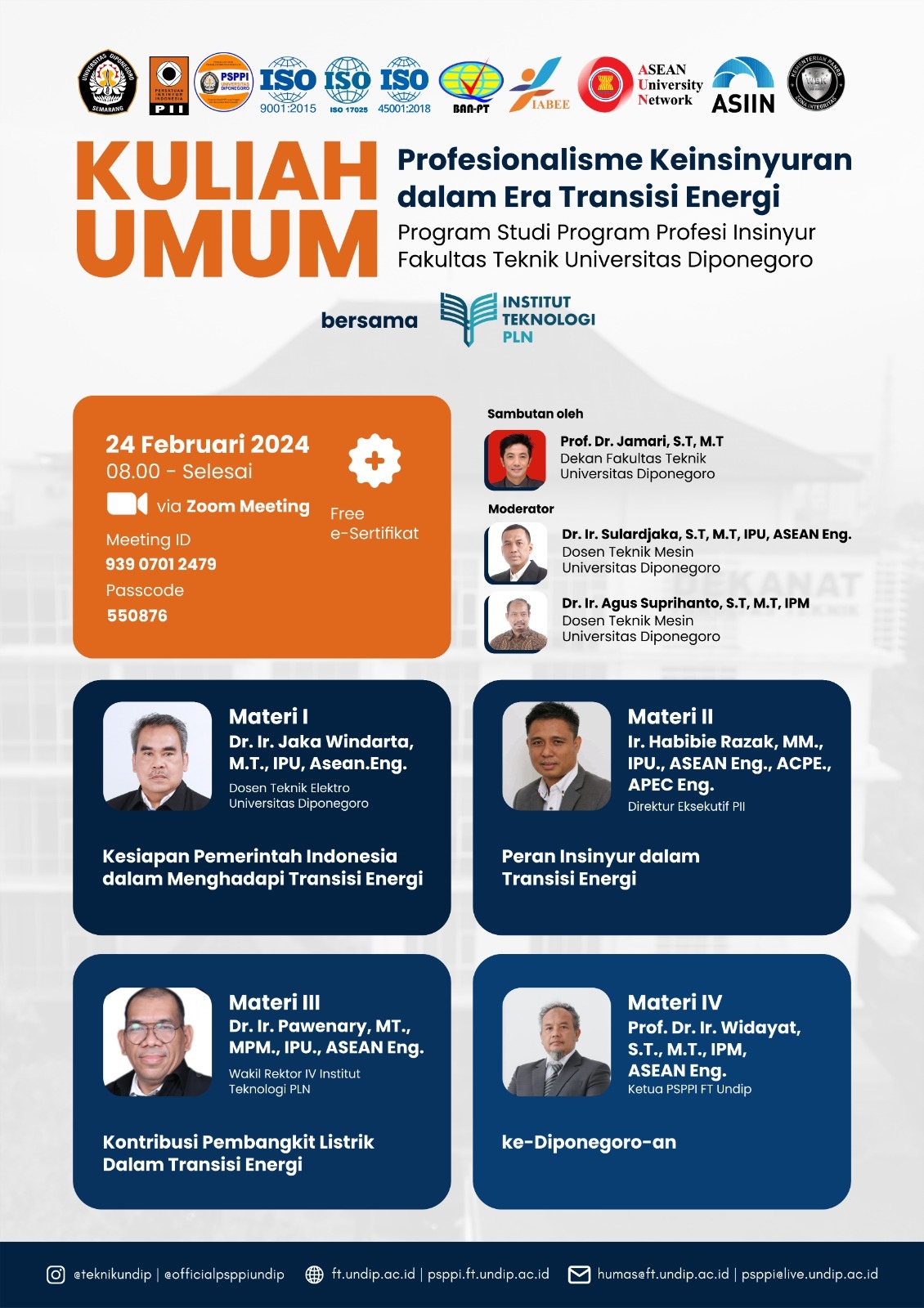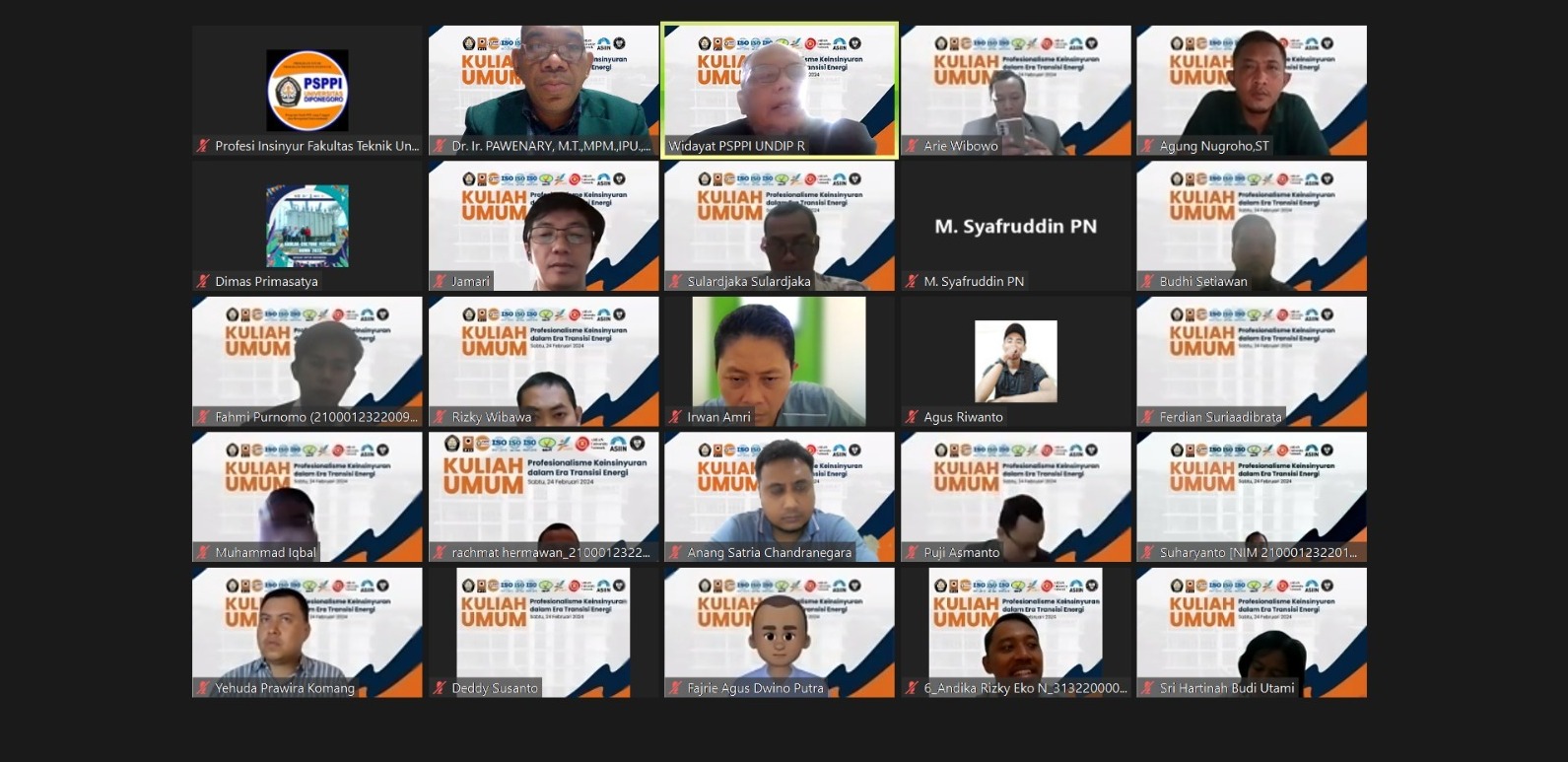 Jakarta, 24 Februari 2024 – Institut Teknologi PLN (IT PLN) berkolaborasi dengan Universitas Diponegoro (UNDIP) menyelenggarakan kuliah perdana Program Studi Program Profesi Insinyur (PSPPI). Dimana sebanyak 99 karyawan PLN grup dan sembilan dosen ITPLN diikutsertakan dalam program ini untuk batch 1, 2 dan 3. Adapun peserta adalah alumni sarjana teknik yang akan mengambil profesi Insinyur. Dimana sebelumnya mereka mendapatkan gelar sarjana teknik (S.T) dari kampus sebelumnya akan menjadi (Ir.) setelah lulus kegiatan perkuliahan tersebut. Acara ini dibuka dengan sambutan oleh Dekan Undip Prof. Dr. Jamari, S.T, M.T.