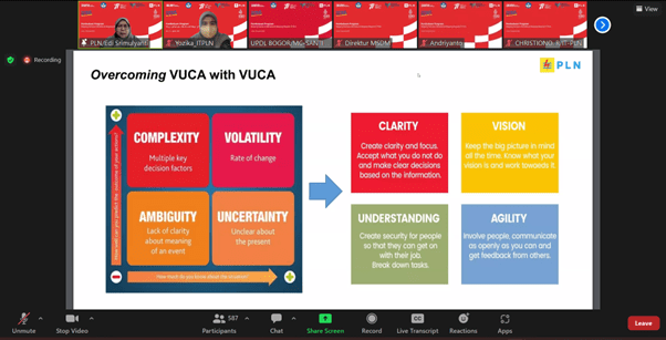 Kemudian dilanjutkan pemaparan materi dari Ibu Edi Srimulyanti selaku EVP Transformasi Korporat dan CEO Office PT PLN (Persero). Beliau membawakan materi tentang gambaran transformasi yang sudah dilakukan oleh PLN dengan 4 strategi utama yaitu Lean, Green, Innovative dan Customer Focused.