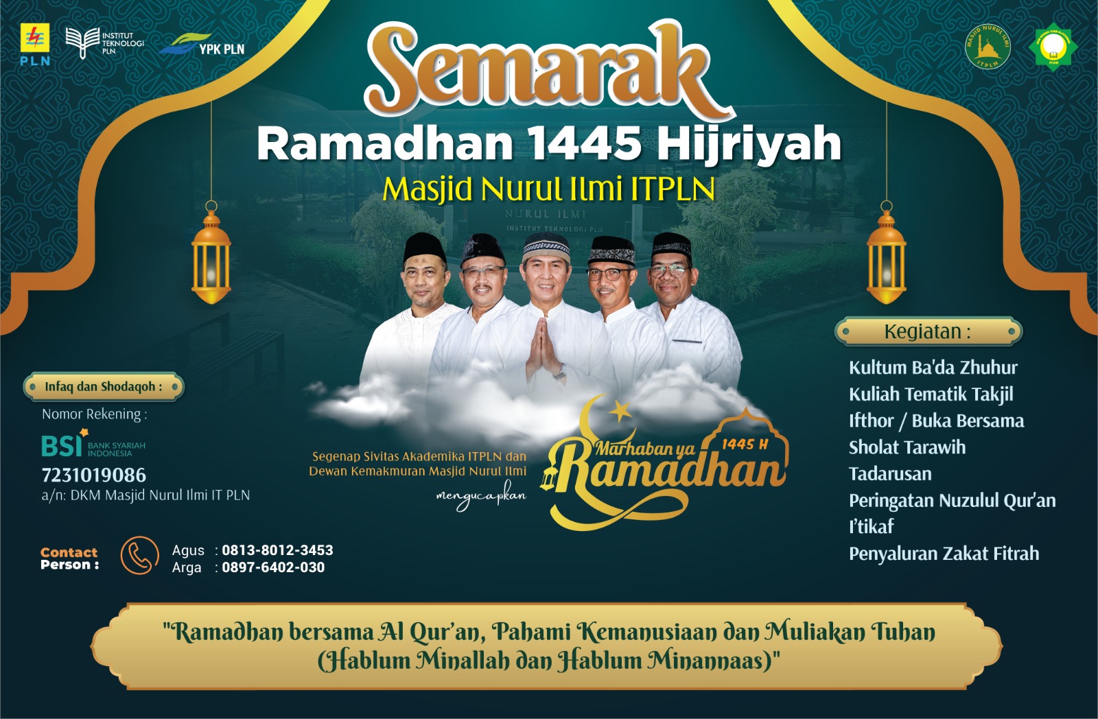 Tema Semarak Ramadhan 1445 H adalah “Ramadhan Bersama Al-Qur’an, Pahami Kemanusiaan dan Muliakan Tuhan (Hablum minallah dan Hablum minansaas)” Dalam suasana yang penuh berkah, mahasiswa, dosen dan seluruh sivitas akademika serta masyarakat sekitar kampus ITPLN mengikuti berbagai kegiatan diantaranya Kegiatan, kuliah ba’da dzuhur, buka bersama, shalat tarawih, tadarus, peringatan nuzulul qur’an, itikaf dan penyaluran zakat.